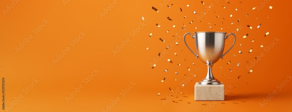 • Celebration trophy with golden confetti on vibrant orange background for award or achievement concept with copy space for advertising or promotion.
