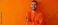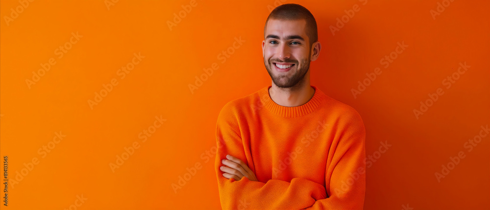 Panel Szklany do Kuchni - A man in an orange sweater standing against a wall. #814133565