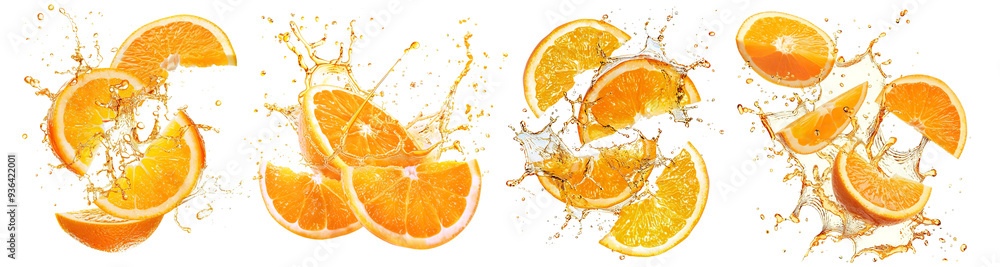 Set of fresh delicious oranges splashing, cut out