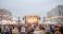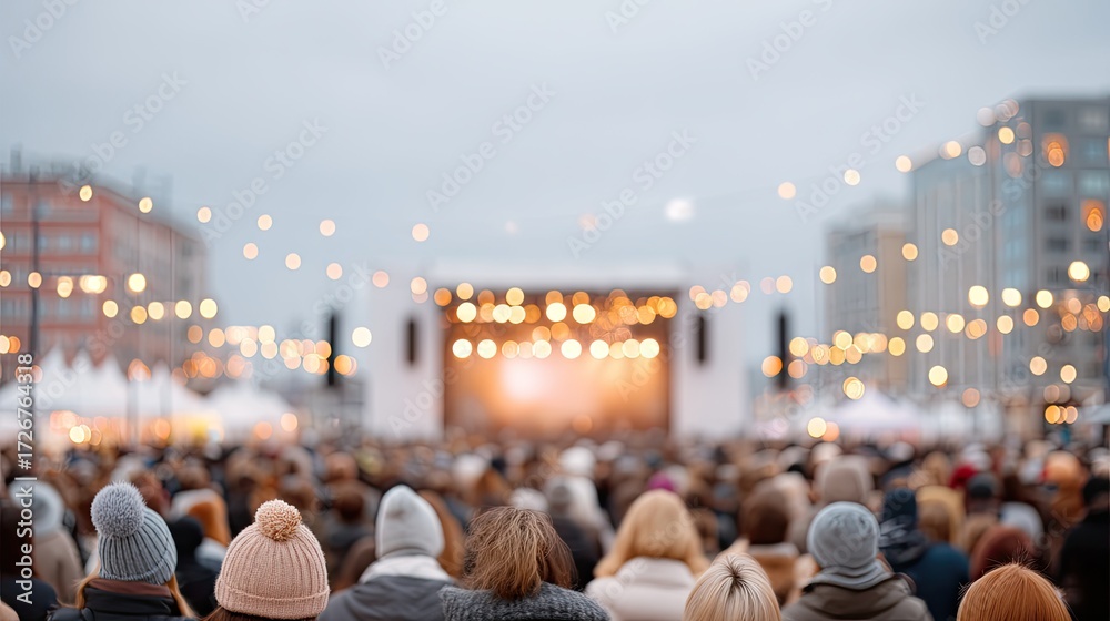• Crowd at Nighttime Concert with Stage Lights and String Lights in City Square with Soft Focus and Evening Atmosphere