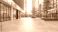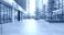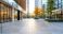 • Modern city square with futuristic buildings, wide pedestrian area, and vibrant trees