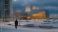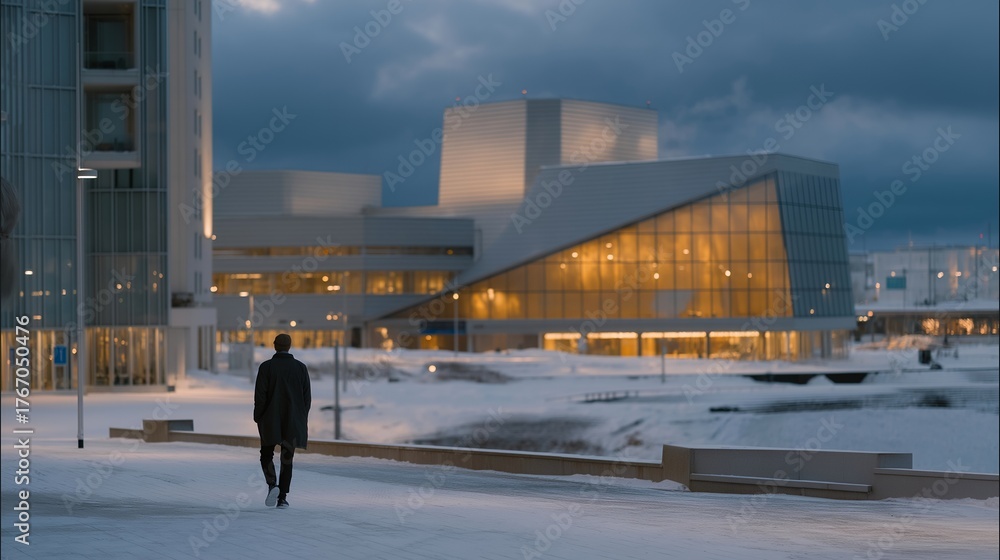 • Lone pedestrian crossing a snow-dusted modern plaza at dawn, breath visible in cold air, surrounded by glowing streetlights — symbolizing solitude, quiet reflection, and minimalist winter city