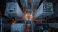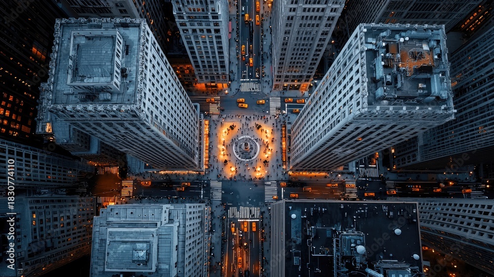 • Overhead Aerial View of a Busy City Square at Night With Tall Buildings Lit Up Orange and Blue Lights People and Cars Moving In A Vibrant Urban Landscape
