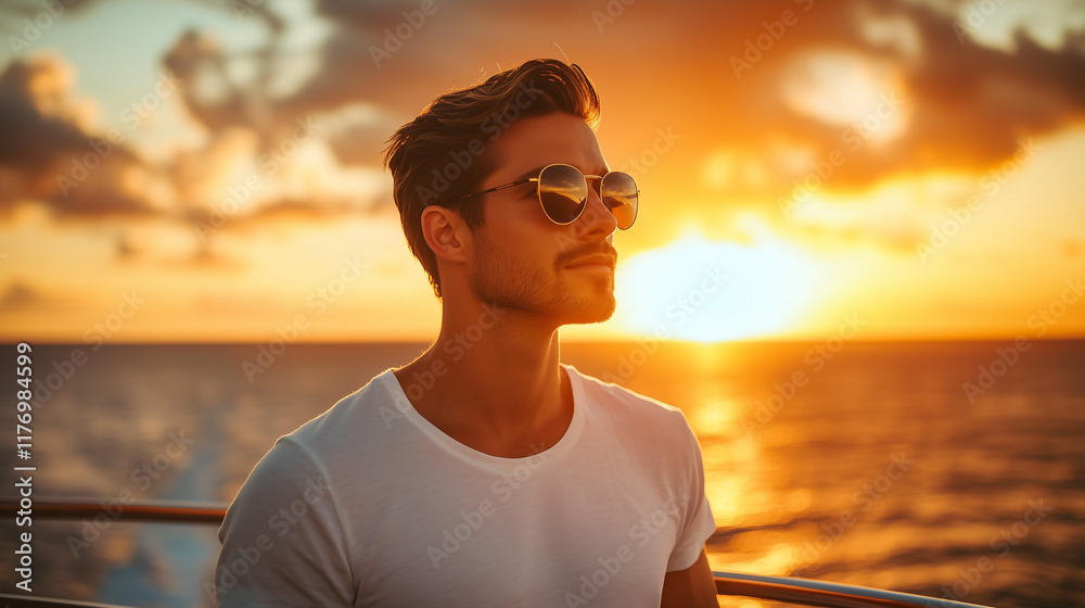 Obrazy Zachód słońca - Stylowy mężczyzna w przeciwsłonecznych okularach stoi na luksusowym pokładzie, spoglądając w dal,... #1176984599