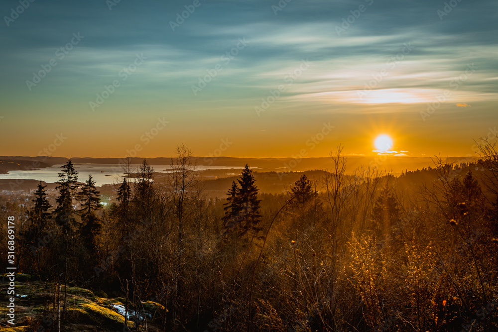 Obrazy Zachód słońca - Zachód słońca nad Oslo stolicą Norwegii widok na Oslofjord #316869178