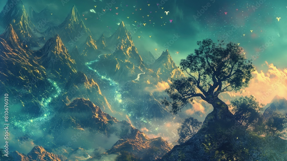 Obrazy Zachód słońca - Malowidło przedstawia drzewo rosnące pośrodku góry, otoczone przez piękny krajobraz górski. W tle... #810676010