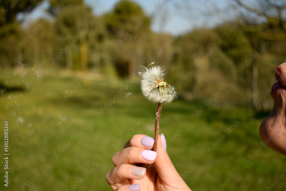 Obrazy Dmuchawce - pedir un deseo soplando diente de león, mano mujer #1002885261