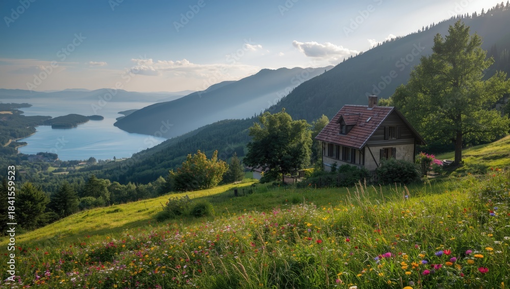 Obrazy Natura - Scenic outdoor setting with water, lush greenery, and mountain house, ideal for nature or... #1841559523