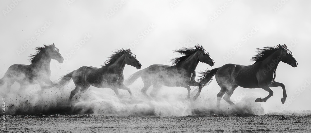 • Majestic horses galloping through a dusty landscape, showcasing their strength and grace