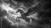 • Majestic winged horse soaring through dark storm clouds - epic fantasy stock photo. Stormborne Pegasus. Illustration