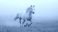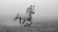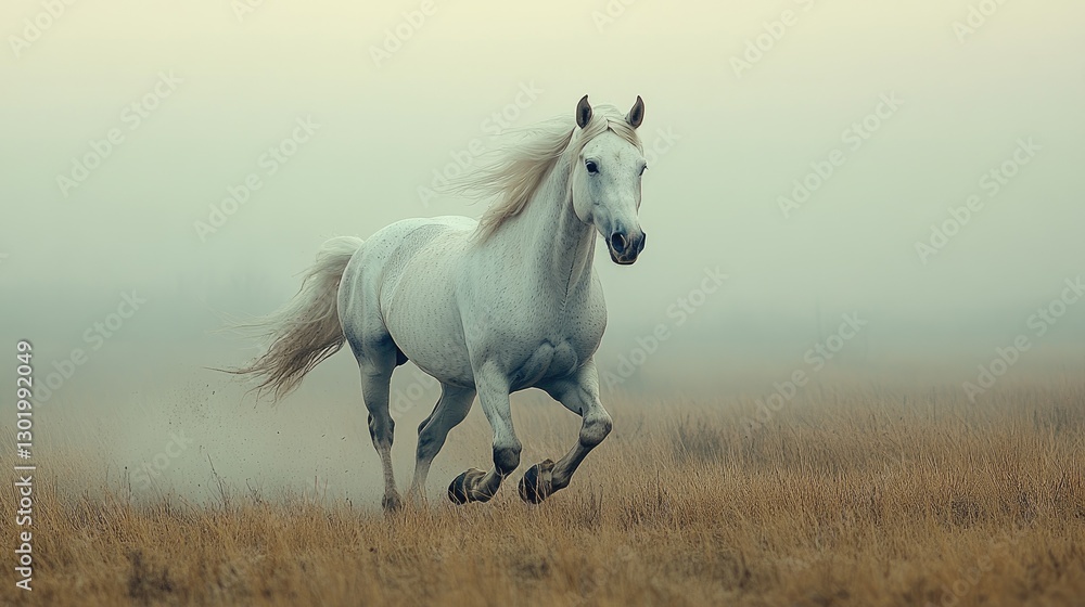 • White horse galloping through foggy field. Stock photo for equine, nature, freedom themes