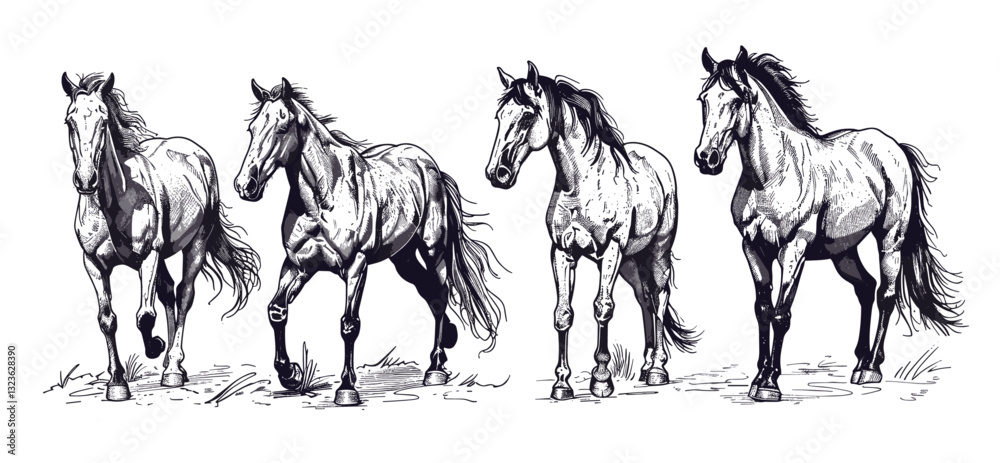 Konie - Horse vector art, wild mustang engraving, isolated horse sketch, vintage ink illustration,... #1323628390