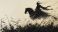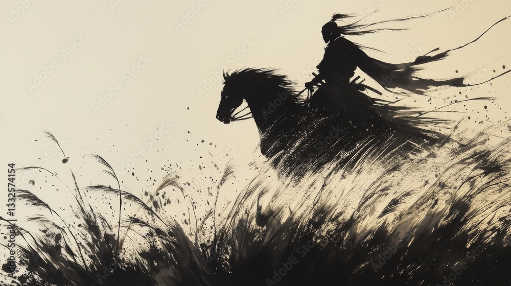 • Silhouette ink painting of warrior with horse in tall grass field on a light background