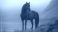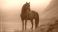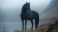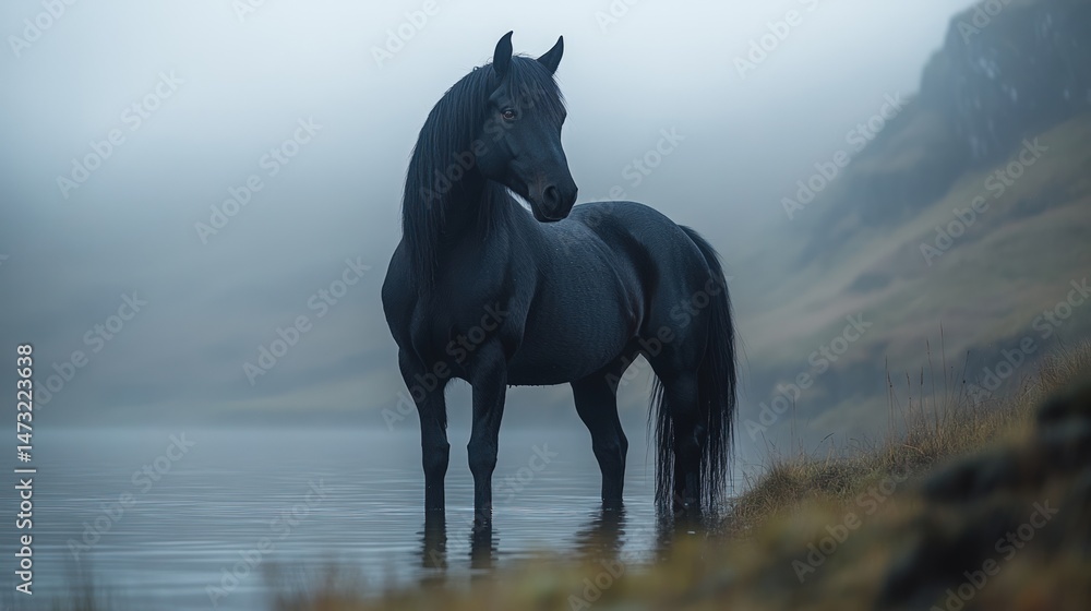 • Majestic black horse stands in a misty river, a tranquil scene of nature