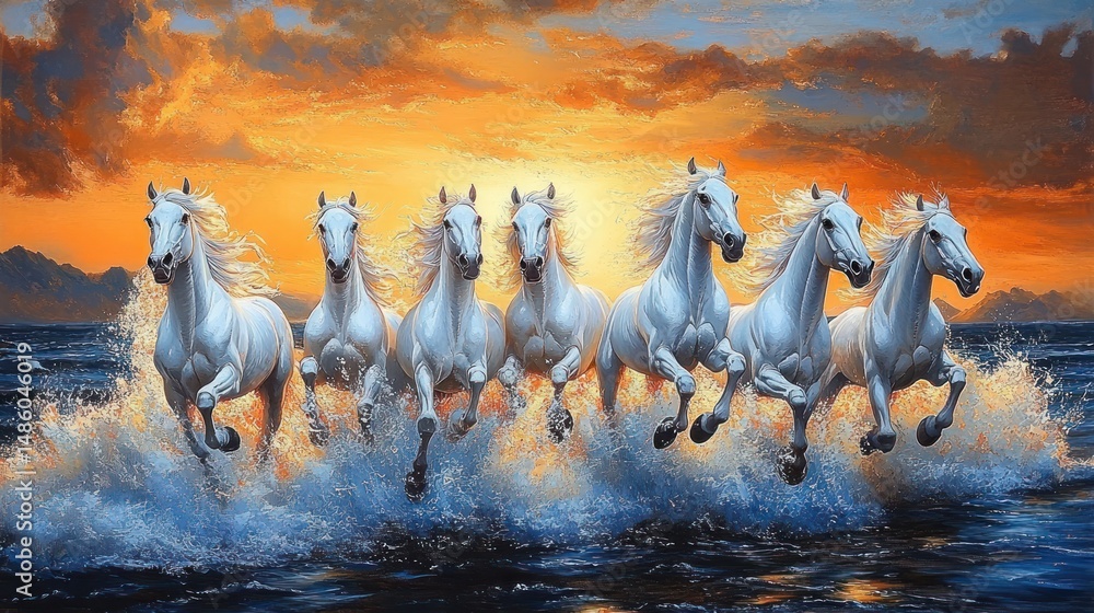 • Seven white horses running through the ocean water during a dramatic orange and blue sunset with waves splashing dynamically