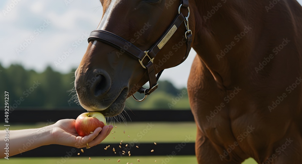 • hand feeding a horse barley, apple, and molasses position subject on the left side of the image with a clear copy space on the right for photos. ,hyper realistic digital art