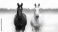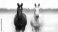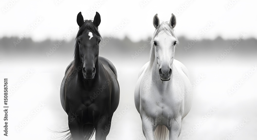 • white horse in the snow.Majestic Black and White Horses: Ethereal Foggy Portrait.