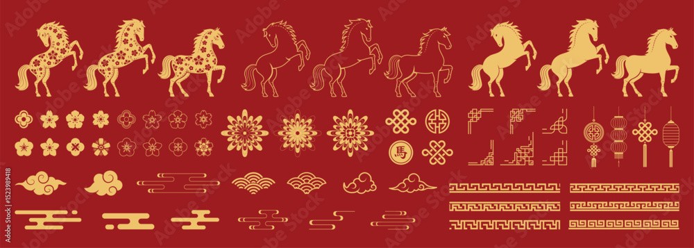 • Chinese New Year 2026 icon set. Includes lanterns, horse, clouds, flowers, and traditional decorative elements.