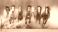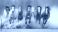 • A group of seven horses galloping toward the camera, kicking up dust in a dynamic and powerful scene.