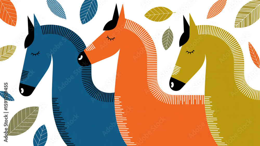 Konie - A stylized illustration of three horses in a minimalist, geometric art style against a white... #1591209455