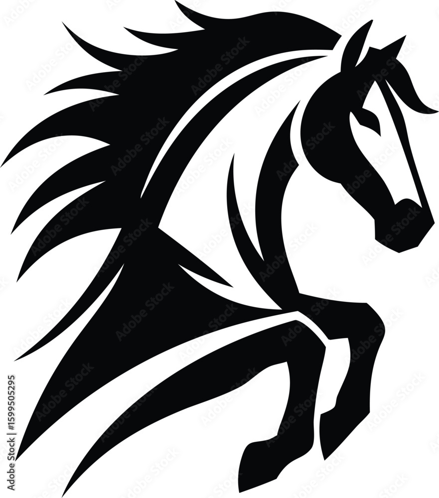 Konie - Silhouette of a rearing horse with flowing mane and tail in black and white minimalistic style... #1599505295
