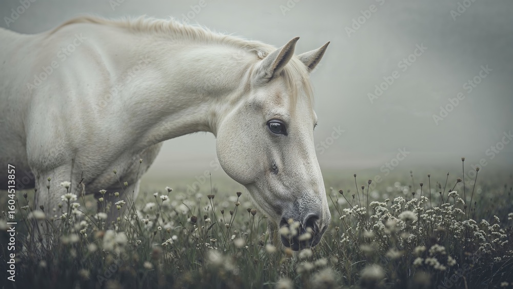 Konie - Cropped image of a white horse grazing in a flowery pasture, captured in a subdued gray-scale... #1604513857