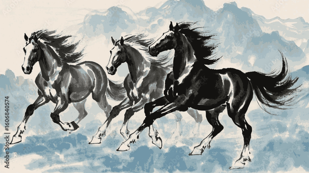 • Wild Flow Three black horses is running isolated watercolor vector illustration svg