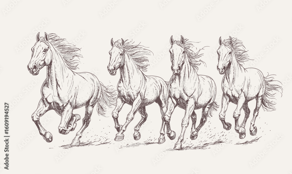 Konie - Detailed hand drawn sketch of four running horses galloping together with flowing manes in... #1609194527