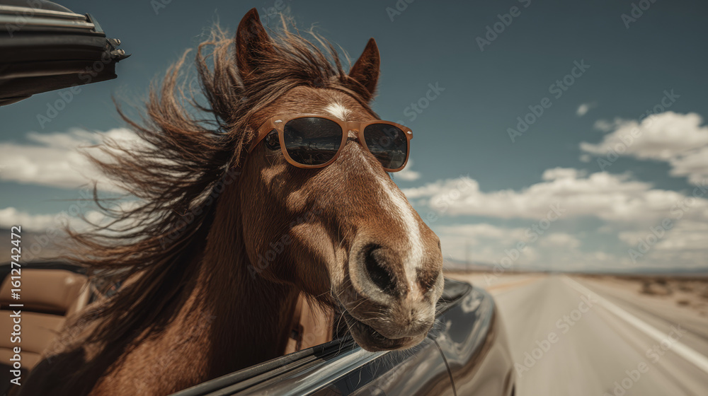 • Cool horse wearing sunglasses enjoying fast ride on highway perfect for humor memes road trip themes animal fun and adventure blogs