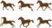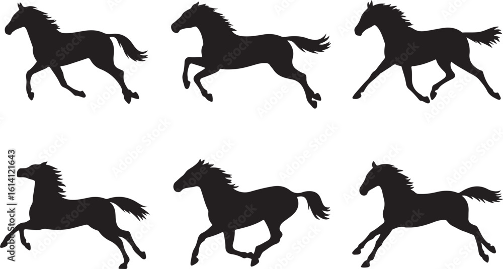 • Six black horse silhouettes in motion across a white background equine