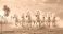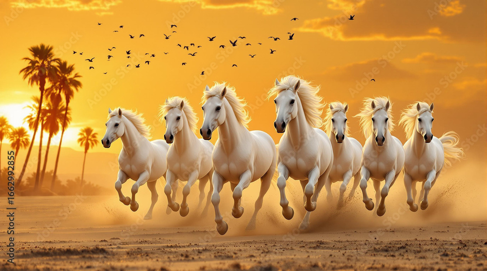 • Seven white horses gallop freely across golden sands at sunset a desert landscape with warm bright