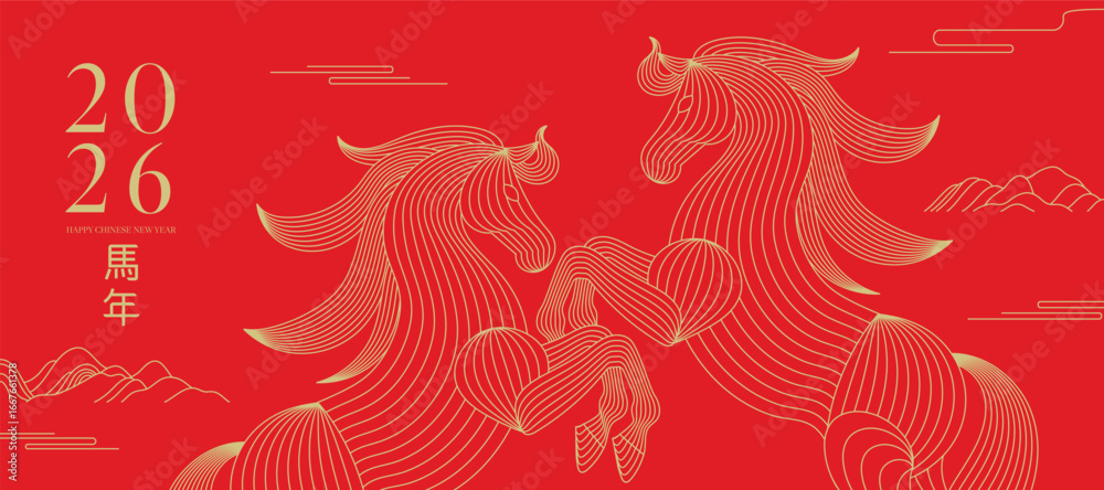 • Happy Chinese new year 2026 on red background design vector. Year of the horse zodiac with horse and mountain gold line art. Illustration for banner, website, social media, Happy New Year, ads.