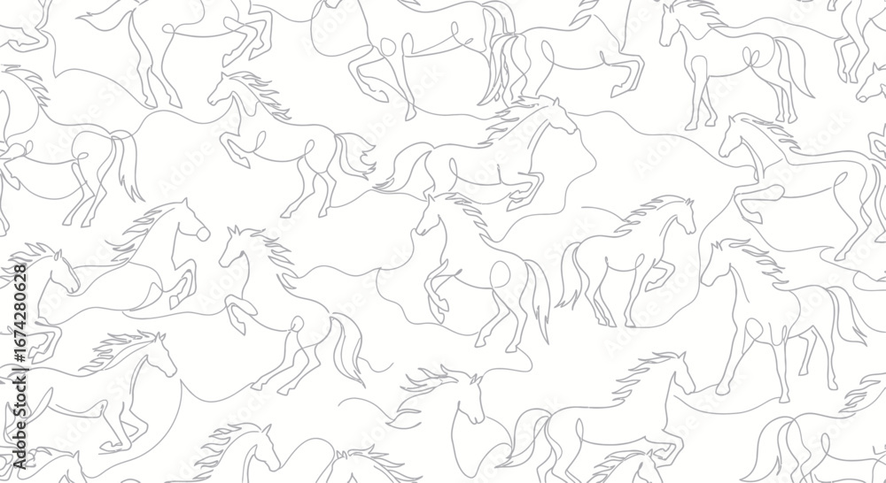 • Seamless pattern featuring minimalist line art of galloping and rearing horses on white backdrop