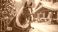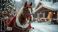 • Thoroughbred horse wearing festive reindeer costume, adorned with jingling bells, standing in snow-covered landscape near decorated holiday home and Christmas tree