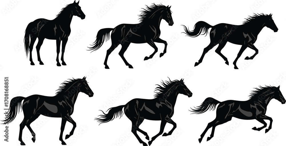 Konie - Horse silhouette motion sequence, galloping animal illustration, running horse vector, dynamic... #1708168851
