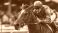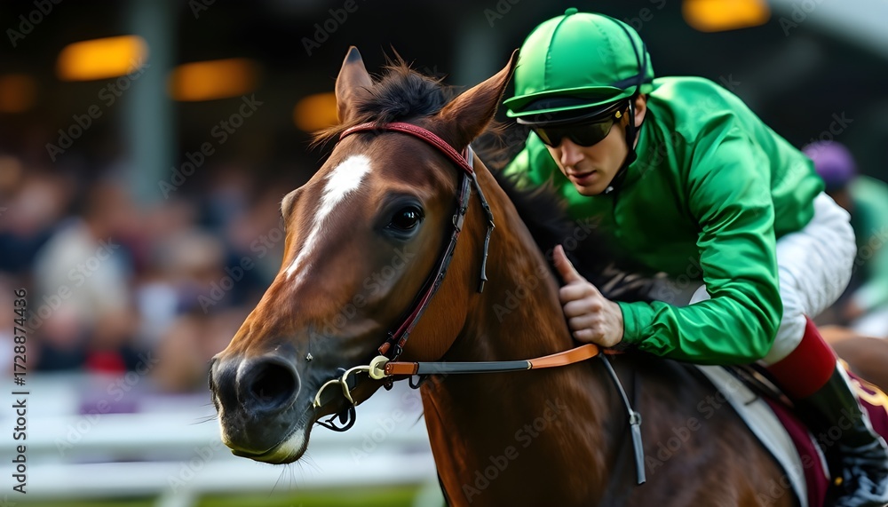 • Jockey riding brown racehorse during competition symbolizing speed, power, and professional horse racing sport.