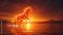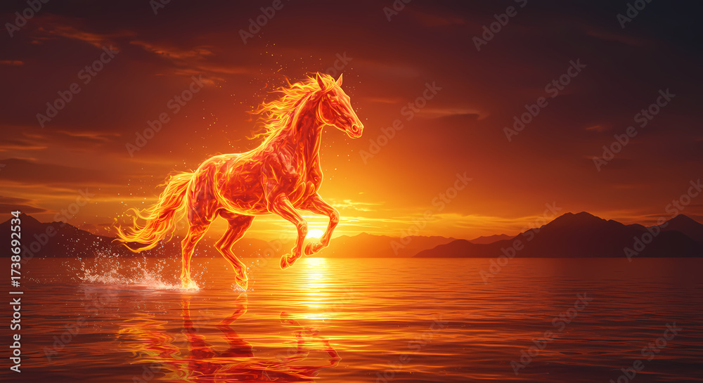 • Fiery horse running in water during sunset representing Red Fire Horse, symbol for the 2026 Year of the Fire Horse, showcasing power and vitality for themed celebrations.