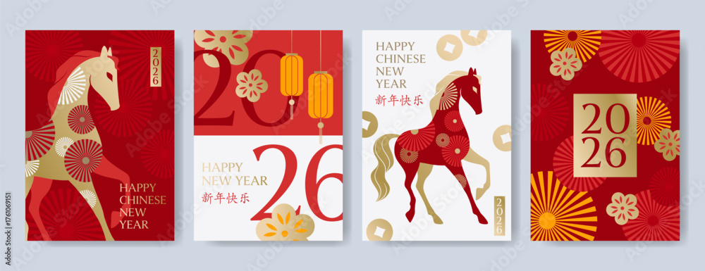 • Set of Chinese New Year 2026 greeting cards with horse illustration, lanterns, floral and geometric decorative elements. Graphic vector templates for holiday invitation, postcard, and banner design