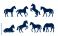 • Set of black horse silhouette icons in various poses. Collection includes walking, running, standing, laying, grazing, and rearing horses.