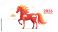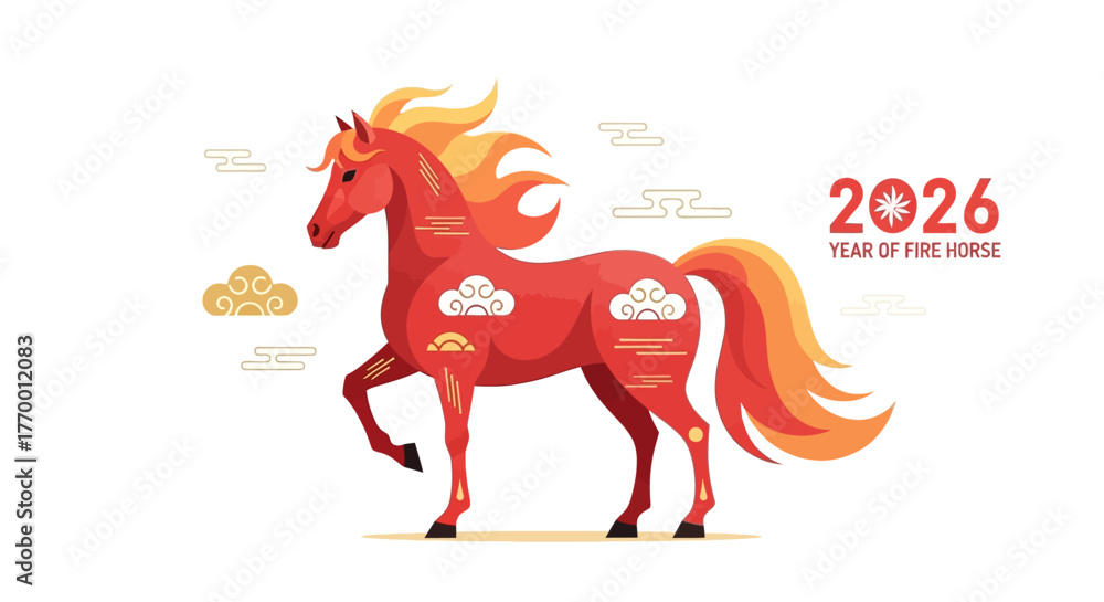 • A vibrant illustration of a red horse with a fiery mane and tail, symbolizing the Year of the Fire Horse in 2026, adorned with traditional Chinese cloud motifs.