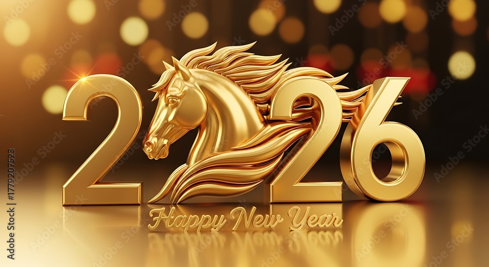 • Golden 2026 new year celebration with a majestic horse symbol