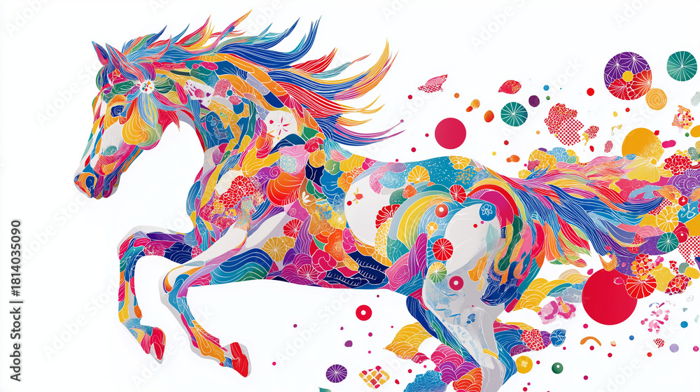 Konie - 和柄の中を駆ける午が新年を告げる、2026年の年賀状にぴったりな和風イラスト。縁起の良いデザインが魅力。 #1814035090