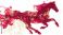 • A majestic horse rendered in a dynamic splash of crimson liquid and golden glitter, galloping with vibrant energy against a white backdrop.