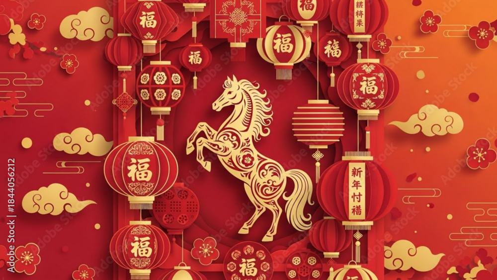Konie - Chinese New Year horse illustration with red lanterns and floral elements traditional festive... #1844056212