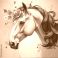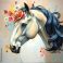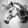 • acrylic painting A black silhouette vector illustration of a fantasy woman's face with flowing hair and flower patterns merged with a horse head in a beauty tattoo art design symbol