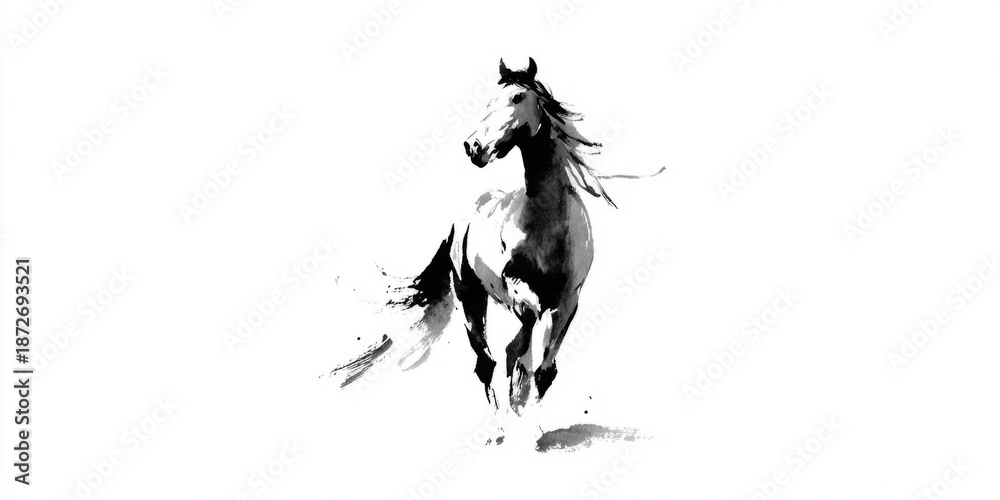• Dynamic wild horse sprinting, minimalist zen ink drawing.