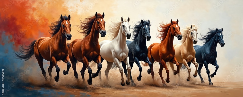 • Seven diverse horses gallop together across dusty ground. Their manes flow dynamically against abstract, painterly sky backdrop with vibrant orange and blue hues. This art conveys power and movement.