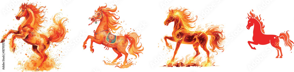 • Watercolor set fire Horse Vector Image for Chinese New Year. Isolated on white background