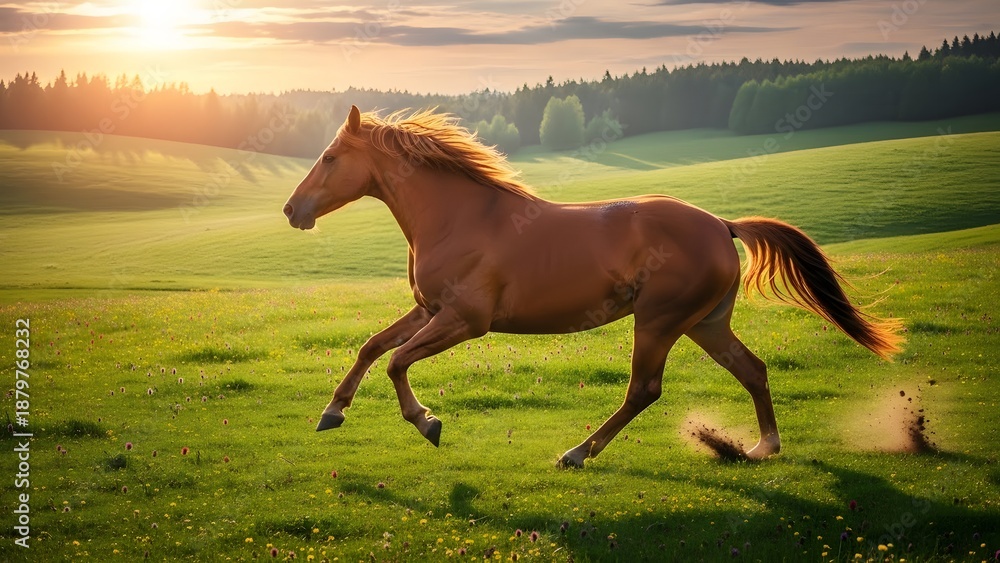 Konie - Stallion Galloping Through Green Meadow at Sunset, Powerful Horse Running in Wild Nature... #1879768232