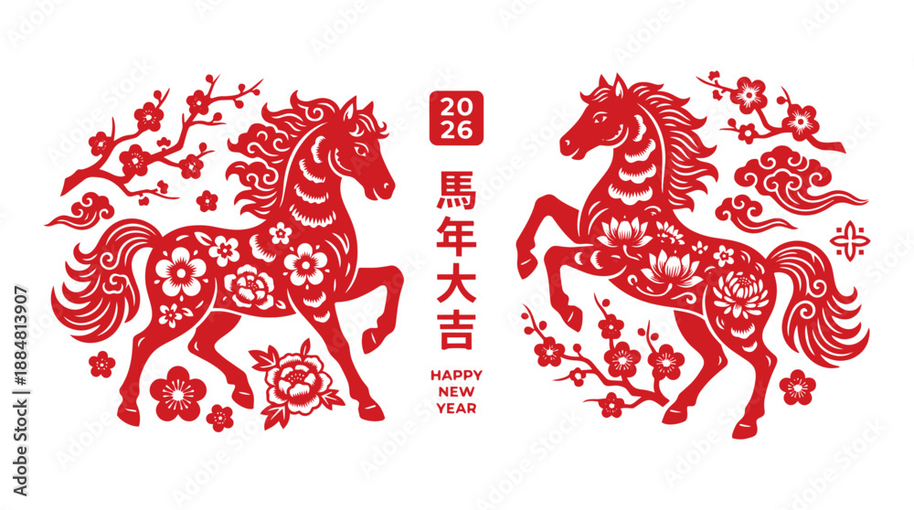 • Lunar New Year of the Horse: A vibrant depiction of the Lunar New Year, featuring two stylized horses amidst a tapestry of traditional elements, celebrating the spirit of the auspicious year.